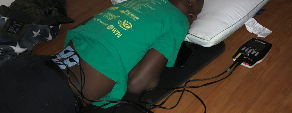 Moment de récupération avec mon teammate Gabe, un tendon d'achilles un peu capricieux, on traite ça directement avec les trainers mais également avec mon compex qui profite à l'ensemble de la team.
